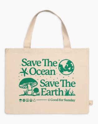 Good for Sunday Organic Cotton, Save the Ocean Tote Bag: A bag that makes a mean green statement as you load up your kale and arugula inside works for us. Buy it here.