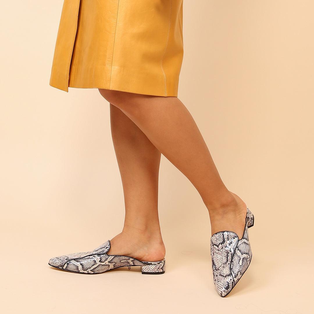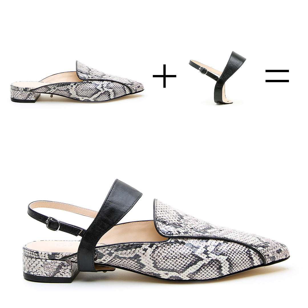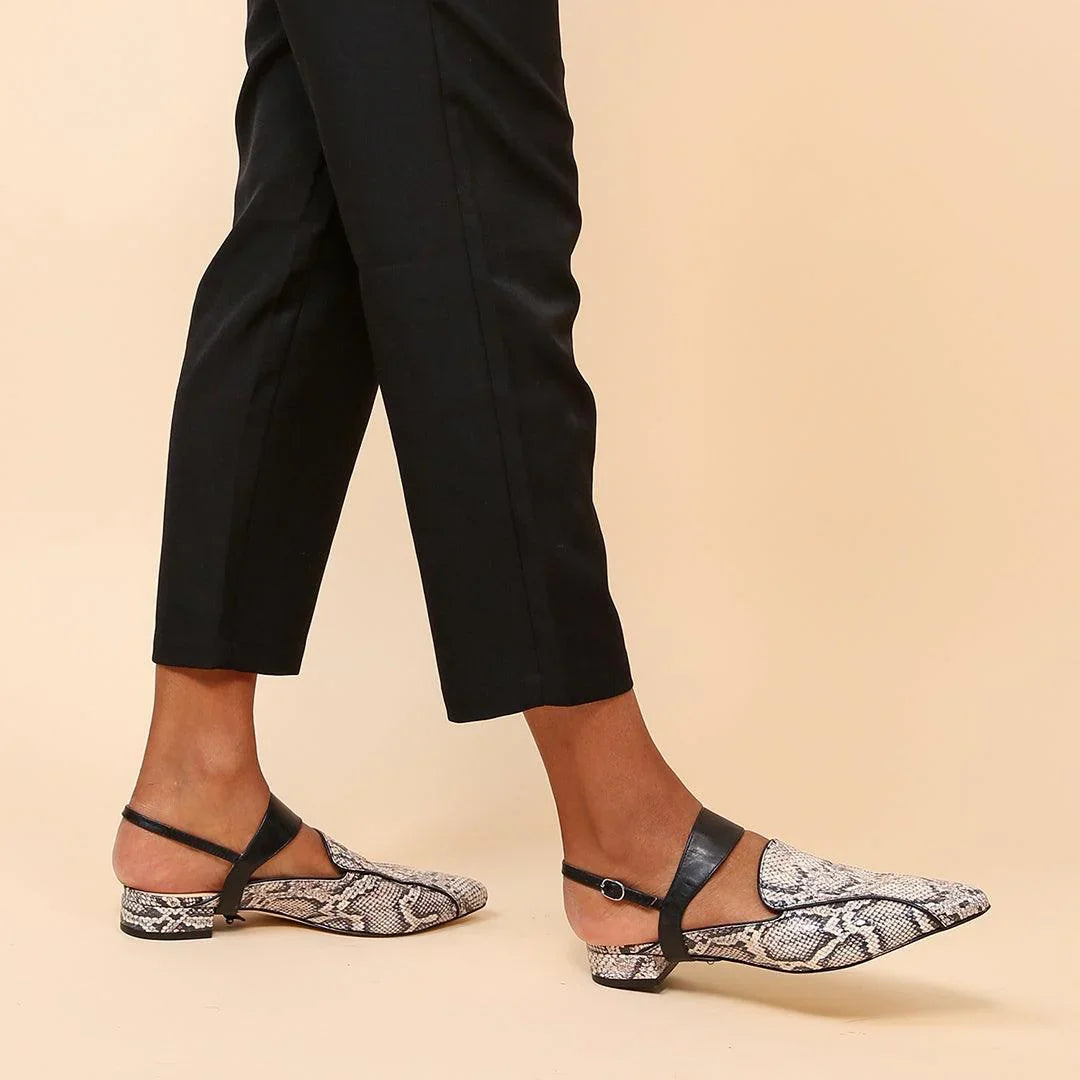 Mocassins pointus chics à imprimé serpent avec une sangle Elsie amovible, du nom de la légende du design Elsie de Wolfe. Pour rendre ces chaussures 2 en 1 ultra confortables, nous avons même allongé la pointe pour que vos orteils ne soient pas écrasés et que le talon soit abaissé plus bas que nos claquettes et mocassins classiques.