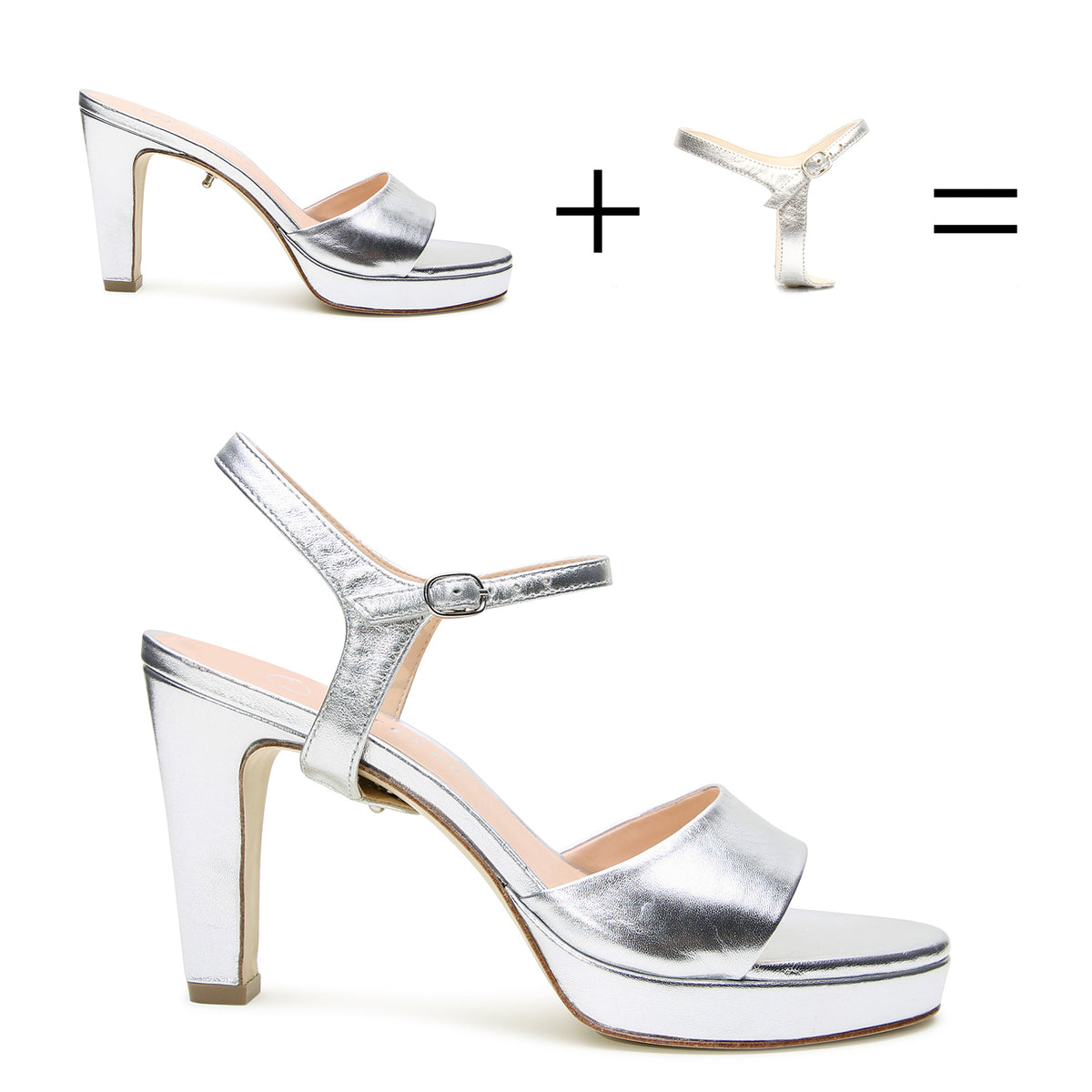 Step into timeless elegance with our versatile silver heels, designed in a chic style with a comfortable heel height and subtle platform for all-night wear. Shown with the Jackie Strap, named after political icon Jackie Kennedy Onassis, this pair channels classic sophistication with a modern twist. Detachable straps let you mix, match, and customize with any Alterre strap, so you can make the look entirely your own for every party, wedding, or special event.