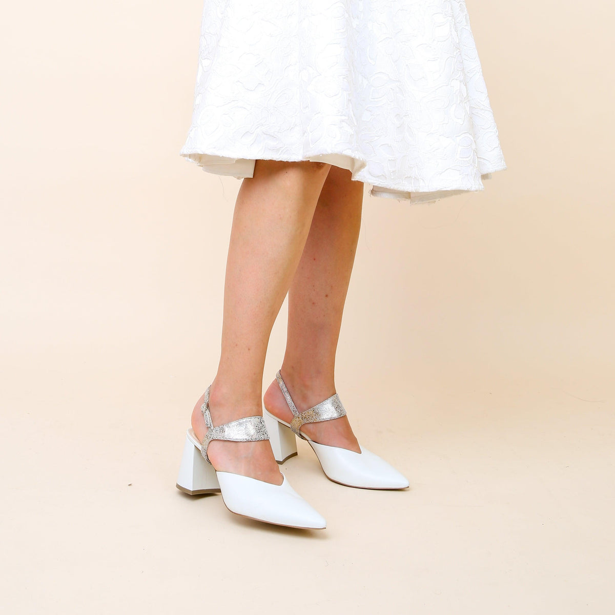 Notre chaussure incontournable à associer avec un mariage fantaisiste en plein air organisé sous une tente est notre bride Stiletto blanche et Lozen argentée . Ce talon est à la fois élégant et fantaisiste. Associé au bracelet Silver Lozen, c'est le match ultime !