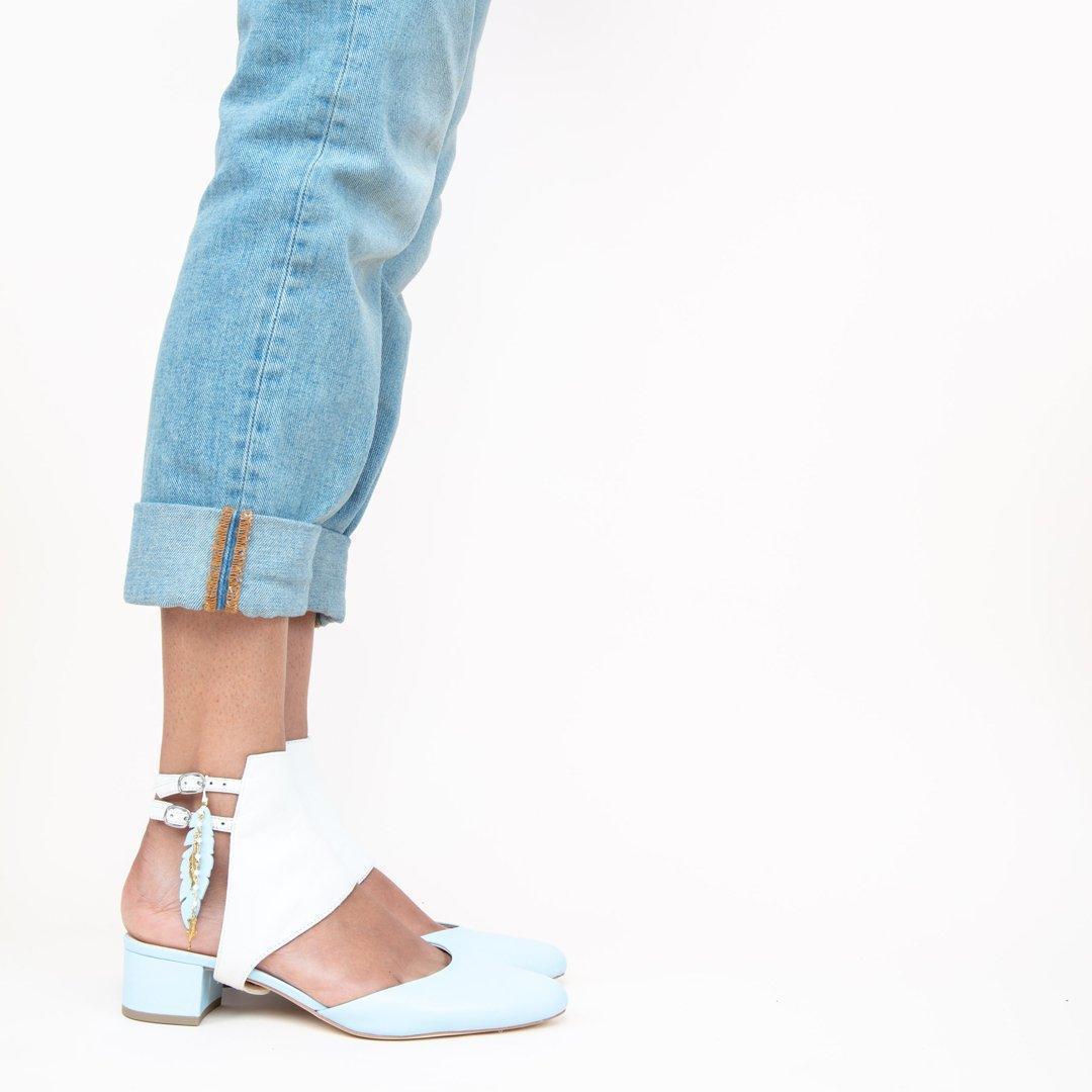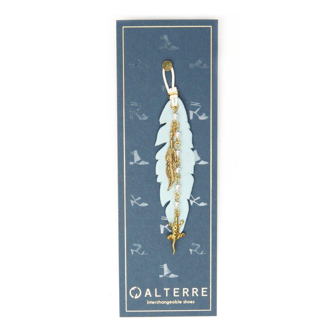 - Leather feather and cording, synthetic pearl beads, coated metal
